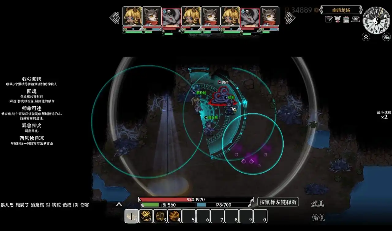 回合制战斗,多样的战斗方式每种武器的攻击方式不同,且可叠加流血、中毒、烧伤等BUFF或是使用暗器,搭配出不同的战斗风格,部分敌人打不过还可以退到边缘(你给路打油)开溜~血量、护甲(绿条)、真气(蓝条)是战斗的三个重要属性,对应物理(护甲)和法术(真气)护盾值可四人一起战斗打群架,可以安排好位置分配:坦克、输出、医疗、辅助等任意选择功法、装备、加点没有限制