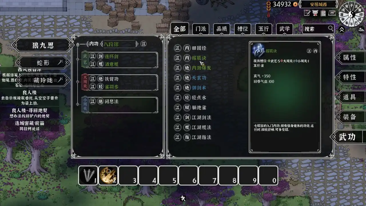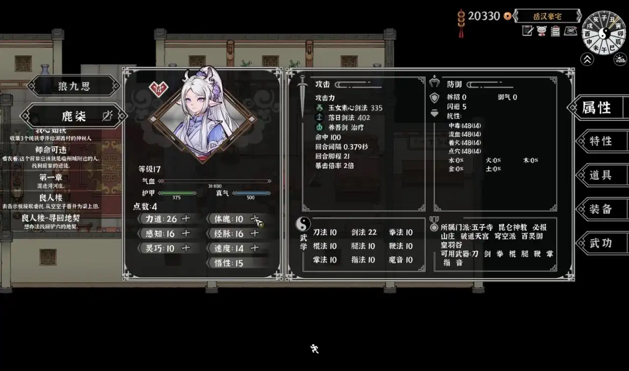 属性点数:力道、感知、灵巧等对应9种不同攻击方式能力值,达到要求值可解锁事件选项升级固定获取或是秘籍、特性中直接加点到对应属性武学:在战斗中积累经验或是在从门派修炼,提升对应武学伤害武功:先学习一门内功可解锁武艺、大周天、小周天的槽位再将学习到的秘籍插入槽位在即可生效,并搭配五行属性来选择,秘籍可以从NPC手上购买或是选择加入七个门派学习各派绝学