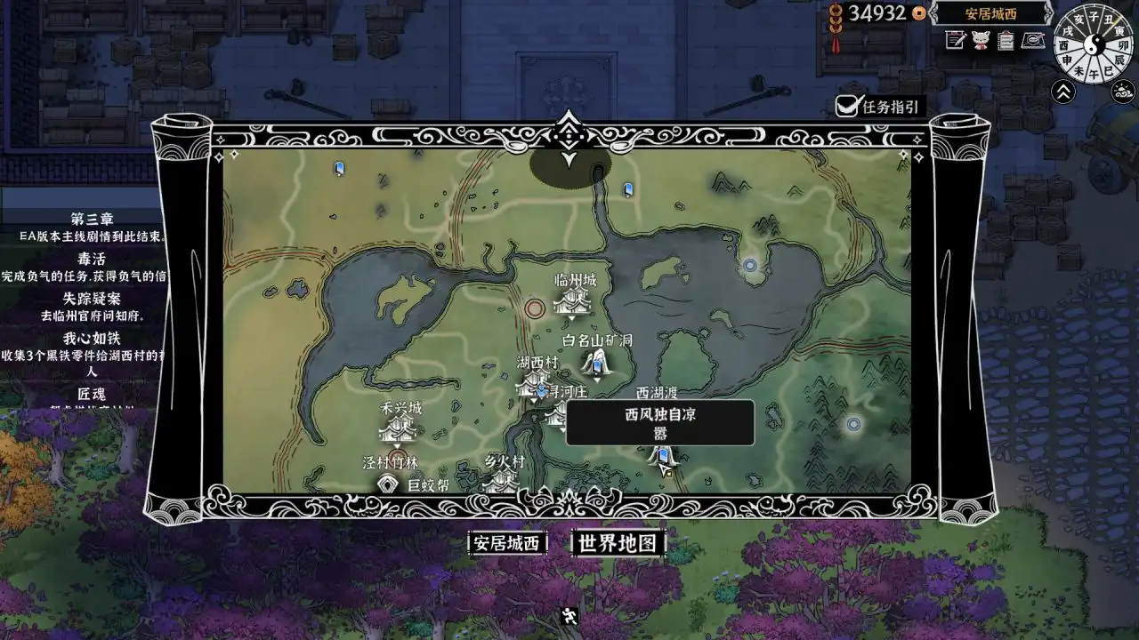 任务指引明了,地图上直接给出了位置,各个已探地点可随意传送,分为世界地图、当前所在位置,切换地图可以看到所在城池商铺、特殊房屋的详细分布没有去过的主城可以通过车夫直接传送,省去第一次跑过去解锁的麻烦