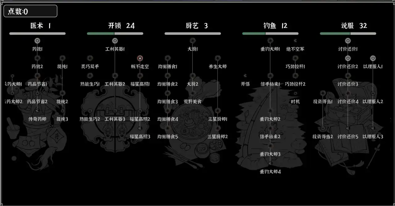 医术、铁匠、开锁、厨艺、钓鱼、说服等生活技能,在进行任务时提供以生活技能的解决选项,随着等级升高铁匠、医术等解锁更多可制作的物品;开锁、钓鱼、说服等可以获取更多的收益、降低难度等