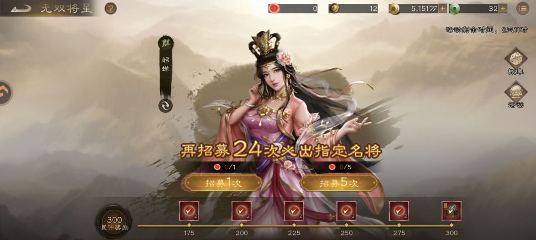 - 第1个月:150抽全抽貂蝉(4只够10星),搭配稀有C开荒,拿1把自选神兵。