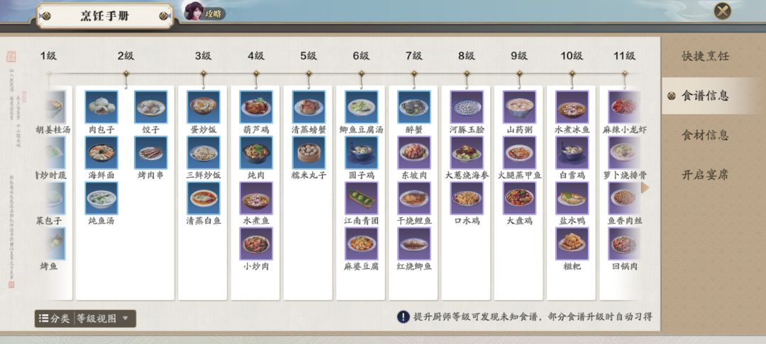 目前楼主20级厨师(正常每周钓满100条的话,现在都应该20级厨师了吧……)总共配方76种,楼主已完全解锁70种(其中梅花汤饼楼主我没材料了,熟练度未满)。具体如图: