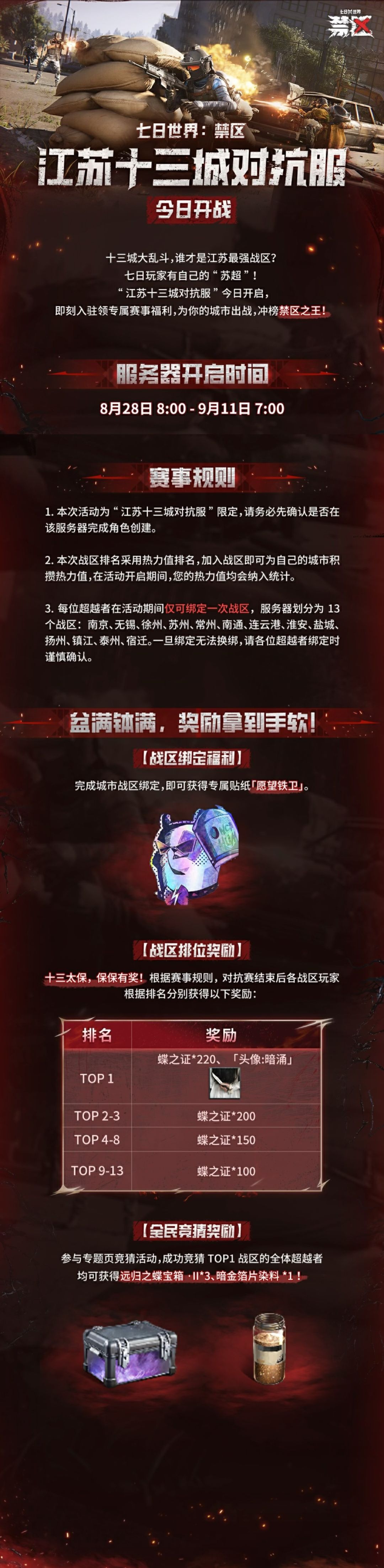 各位超越者们!小七高调宣布:七日世界有史以来最大规模的“内战”,它来了—— 江苏十三城对抗服今日火爆开赛! 如果说苏超的看点在于热血的体育精神,那么在禁区,瞬息万变的无规则混战则又是另一种畅快体验!玩家各显神通,打法五花八门,不到最后一刻,永远猜不到谁才是真正赢家!速速集结你的全城bro一起参赛!能否为家乡扳回一局,就看你的了!