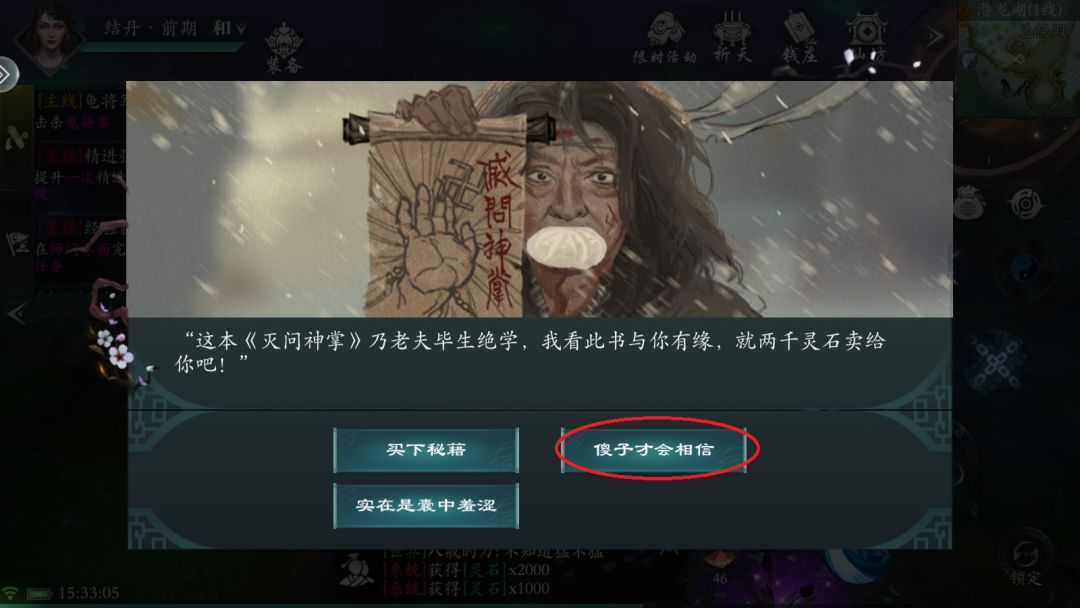 一直点击直到出现上图对话,得到彩蛋*1,可出售得到10w灵石