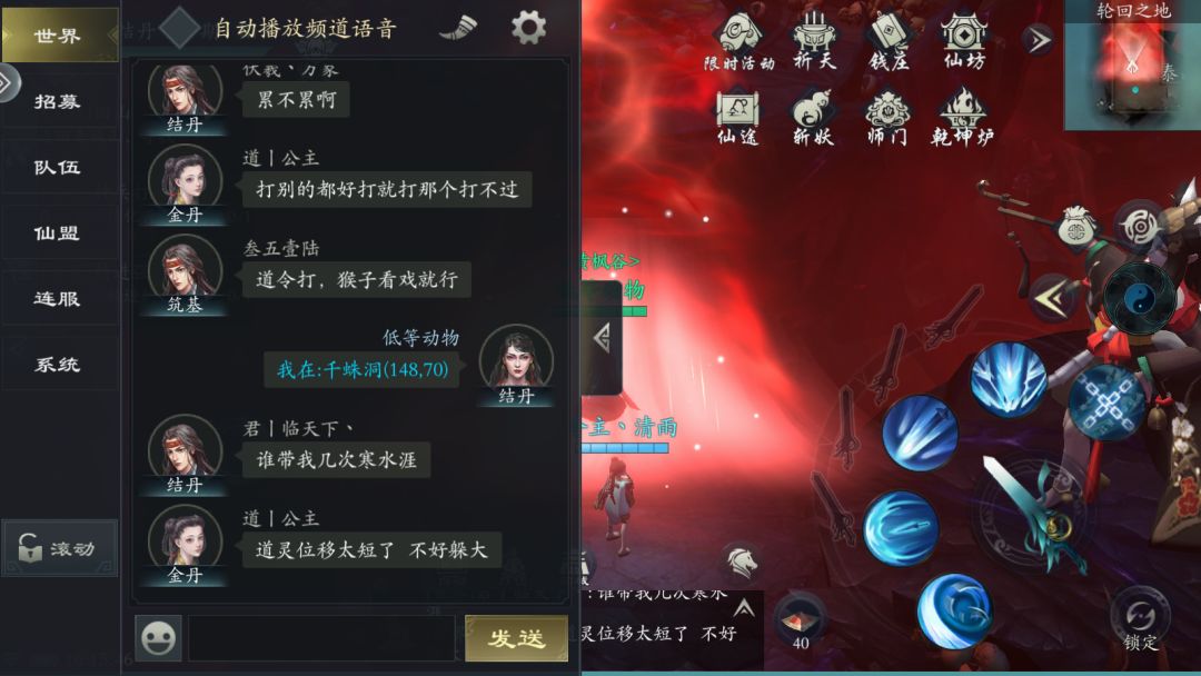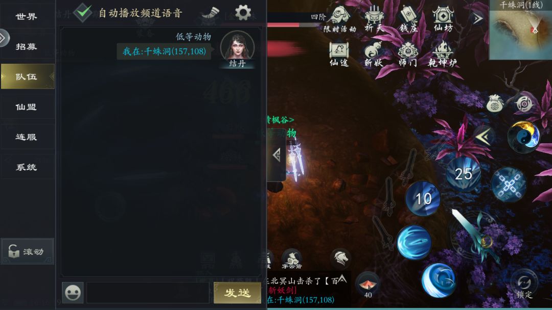 这里我们去偷千蛛洞得灵气,来到半路上已经要被小怪打死了,这时候我们可以单独开一个队伍,在队伍聊天里标记位置,只有我们自己可以看到,因为世界和仙盟聊天过多,可能会导致我们标记的点被覆盖,很难去找到,因此队伍聊天频道单开是一个很有效的手段。