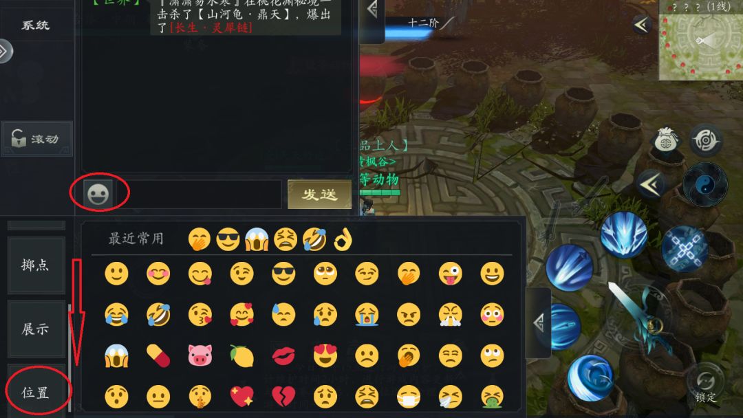 点击表情按钮后,左边菜单往下拉,最后点击一下位置即可标记当前位置