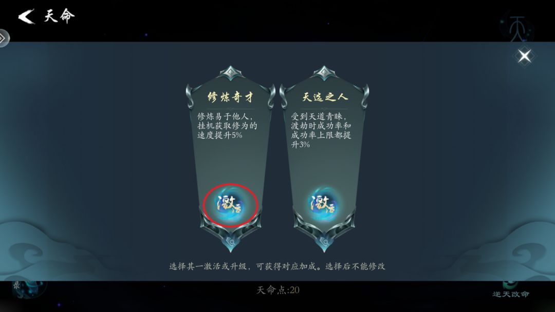 这里如果极端点可以选择升级修炼奇才,反正到化神期可以免费获取天命石*1,可以重新进行一次选择!