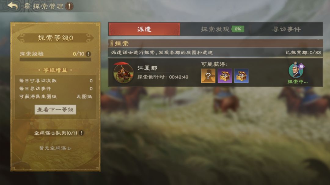 解锁探索系统后,主公需要每日清理相关的探索任务,以获取所有的奖励。同时,尽快升级探索系统,解锁寻访系统,也能够获取更多奖励!
