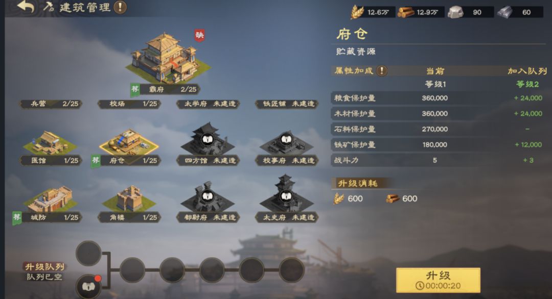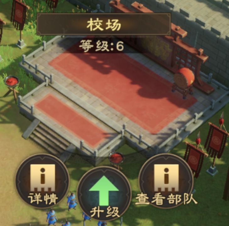 升级校场建筑,提升带兵量,可让自身兵力变多,提升实力。