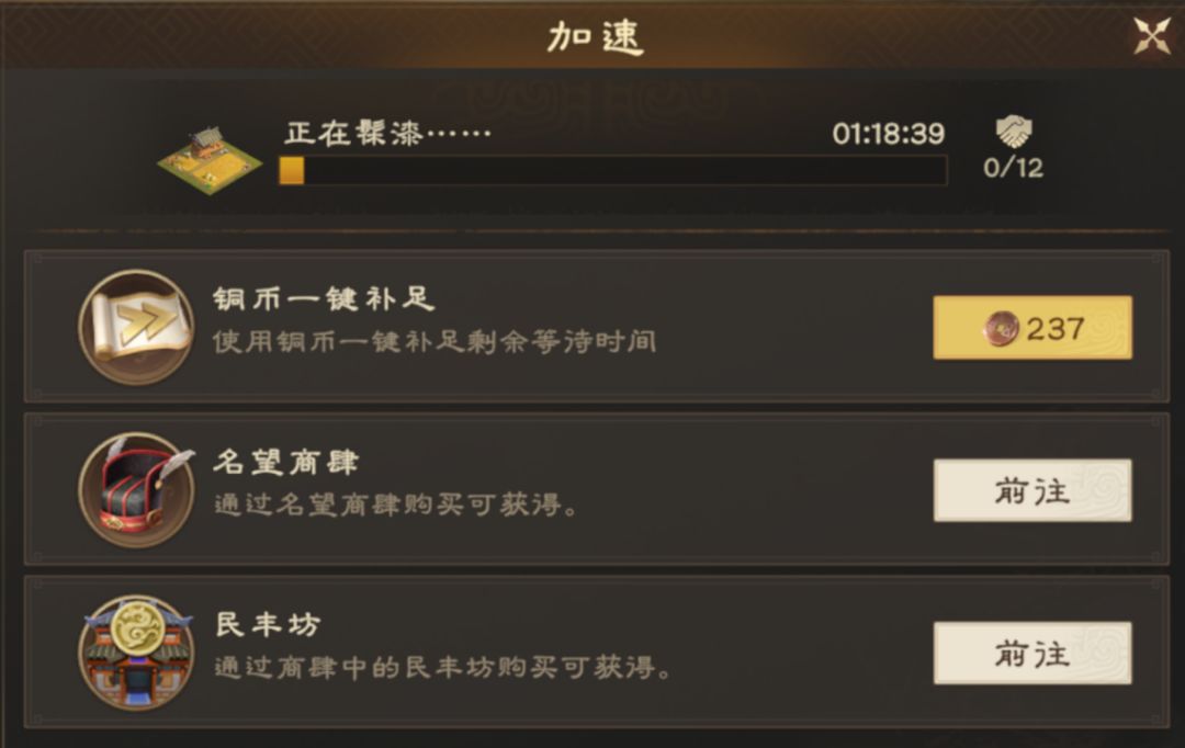 如果没有加速道具资源,主公可通过系统提示进行获取,例如在民丰坊和名望商肆中购买,或者用铜币进行直接代替。
