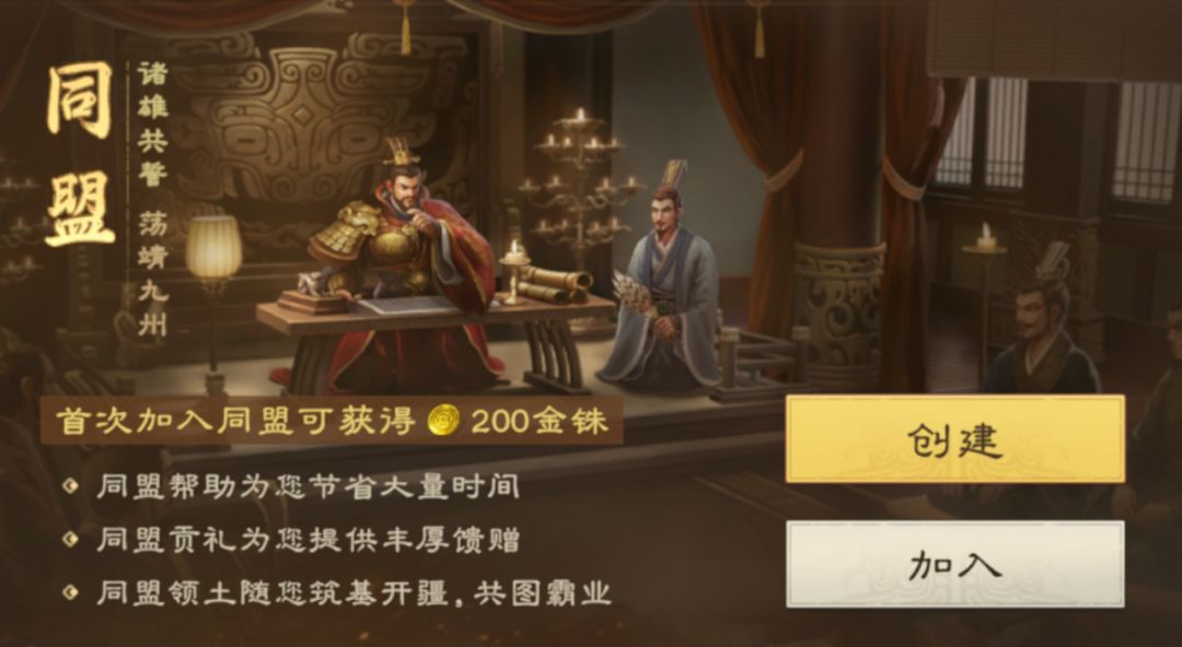 在《偃武》的世界中,主公不须愁独往,山水有同盟。同盟的存在可为主公带来诸多益处,例如首次加入可以获得金铢,节省建筑建造时间,以及其他各种加成。