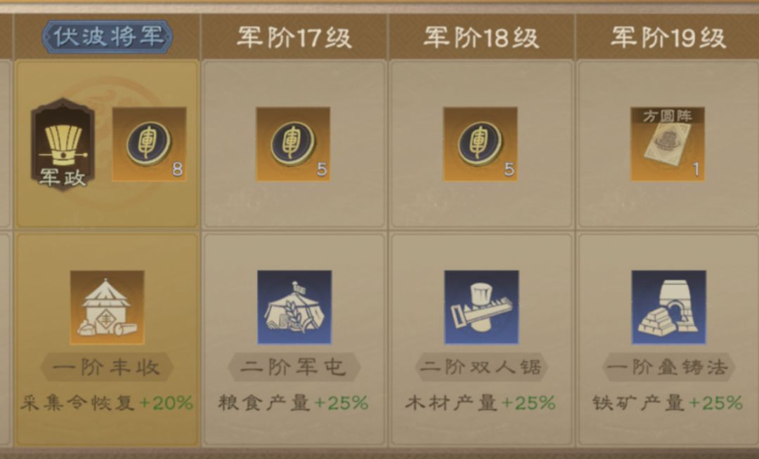 军阶还关联到军政系统:解锁高阶兵种,以及各种资源产量等,所以主公可一定要尽可能迅速地升级军阶呀!
