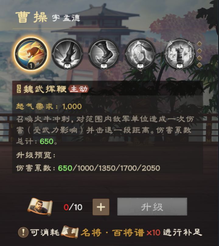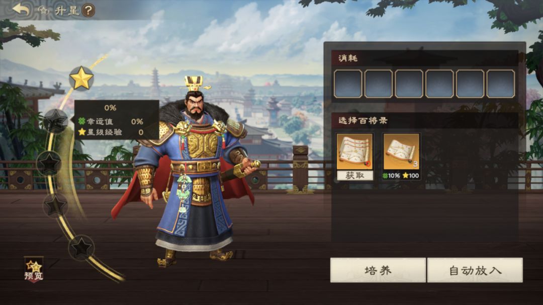 主公可消耗同名武将材料,以提升武将的技能等级,从而提升战力。