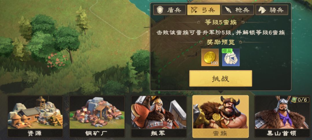 不过,挑战蛮族时,需主公选择自身开荒队伍克制的兵种,才能获得更大的战斗优势!比如,主公自身为骑兵,则需要选择盾兵。