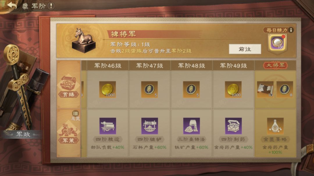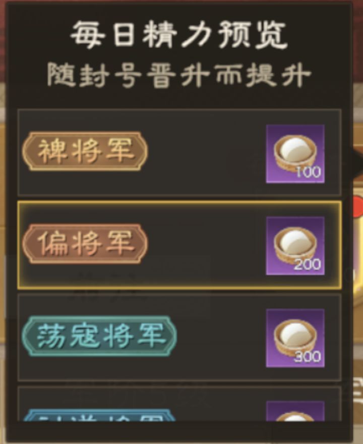 每日精力获取也关联到军阶。阿武有个小妙招,主公第一时间不要领取,等到军阶提升后再领取,便可又小赚一笔!