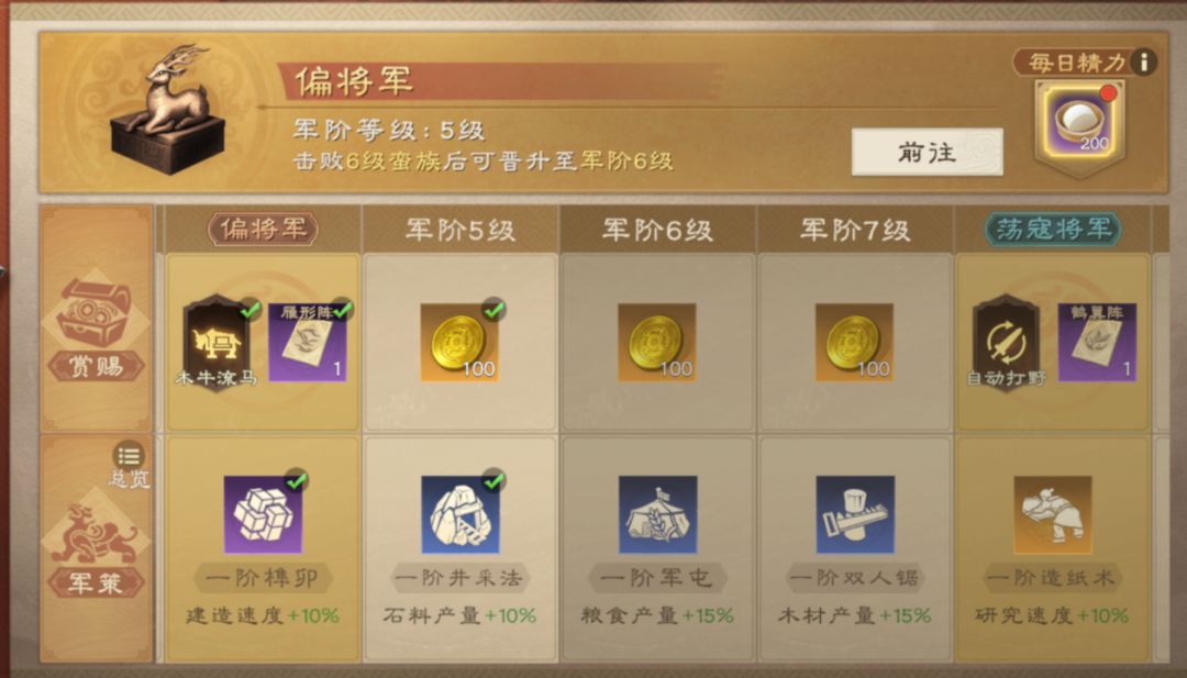 击败相应等级蛮族,即可提升到相应军阶,而军阶又直接影响到各种奖励。所以提升军阶为重中之重!阿武建议主公应竭尽所能,在前期开荒的第一时间就将军阶提升到最高!