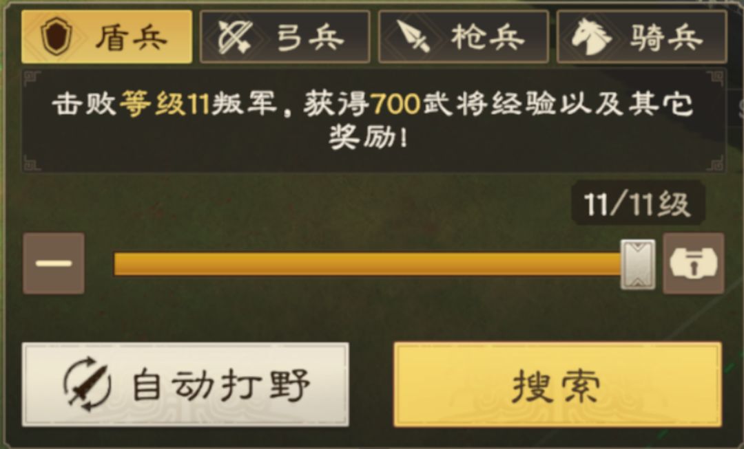 培养武将,也可提升战力等级!最简单的便是给武将升级,此处选择叛军,花费精力进行扫荡即可。