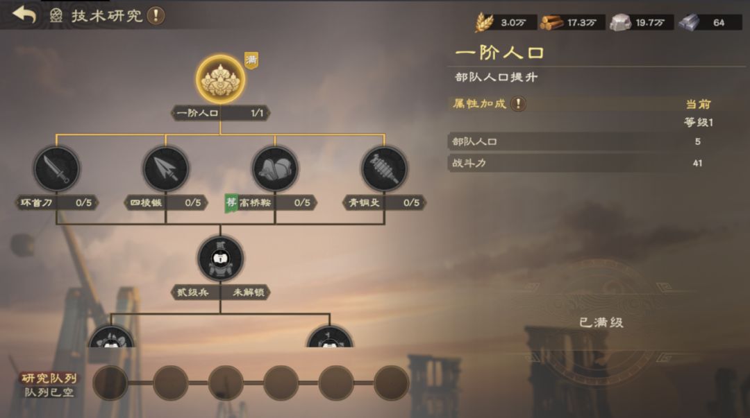 此处优先推荐研究人口技术和兵种等级技术,可大幅提升战斗力。