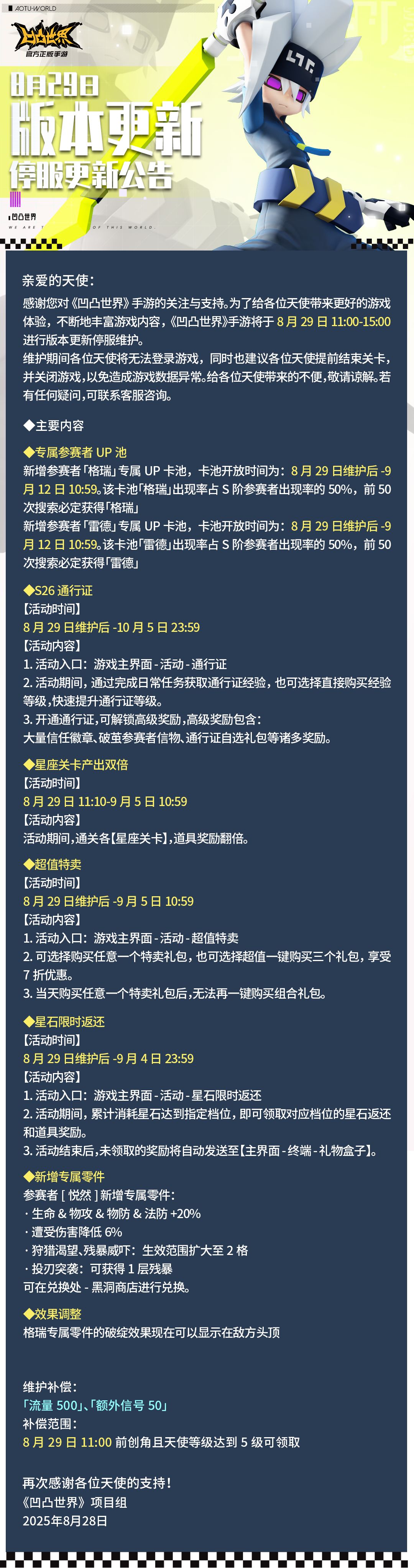 《凹凸世界》手游将于8月29日11:00-15:00进行停服维护。