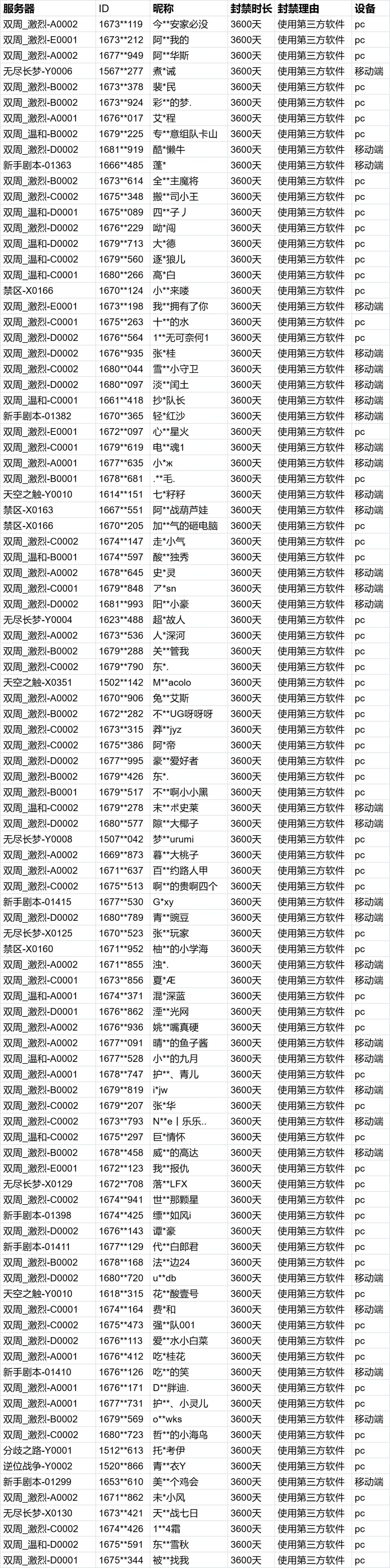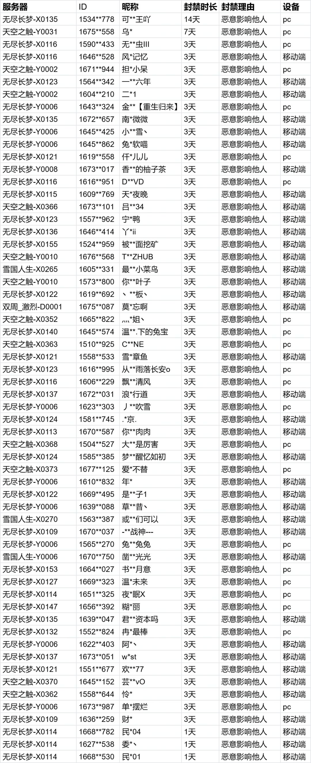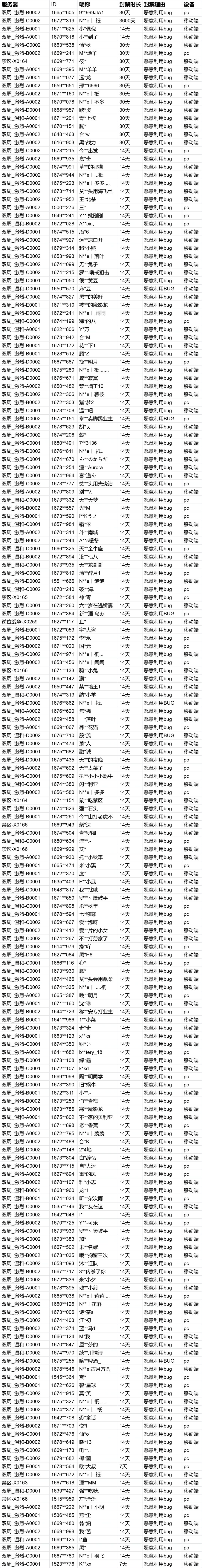 以下为2025年7月30日至8月25日期间因恶意利用游戏机制被处罚的玩家名单,由于篇幅原因,仅展示封禁处罚名单: