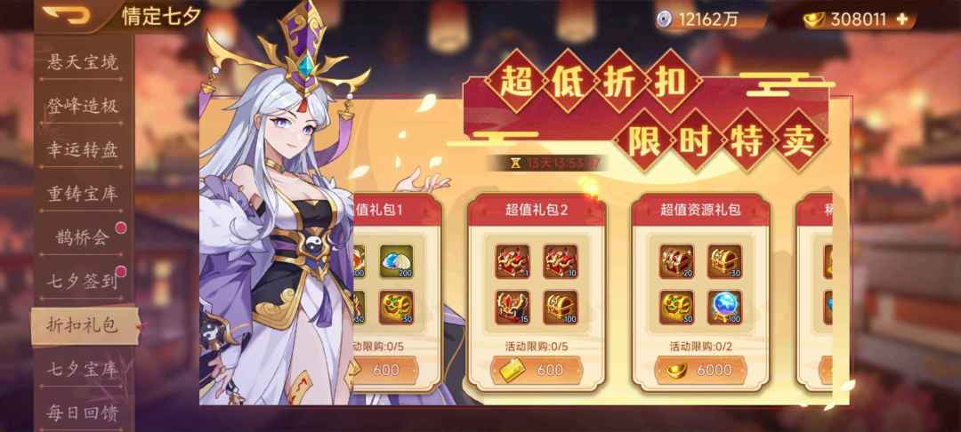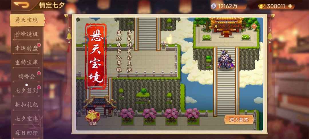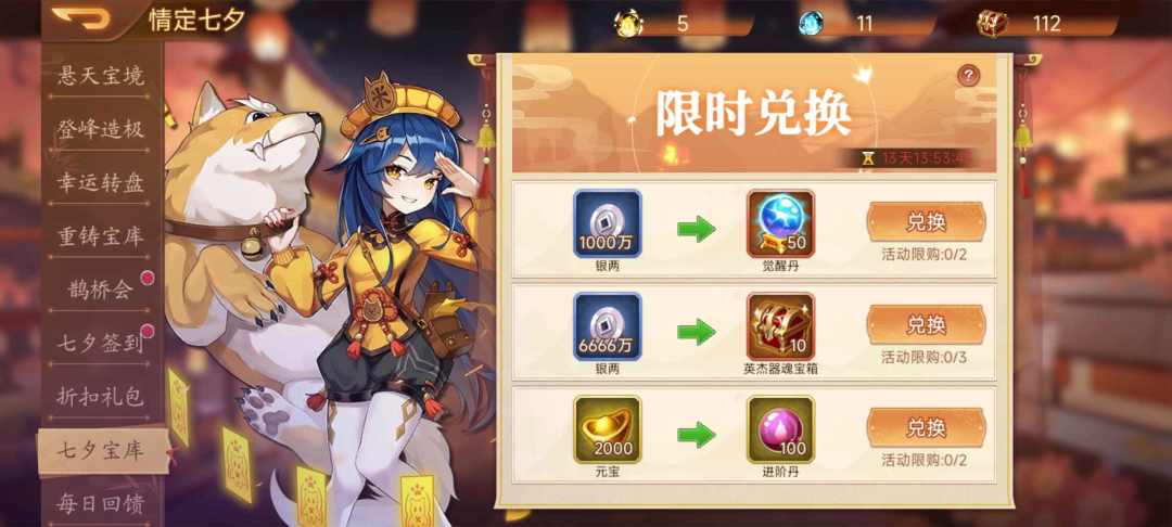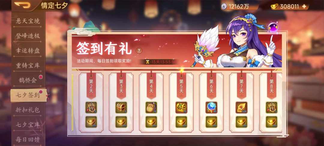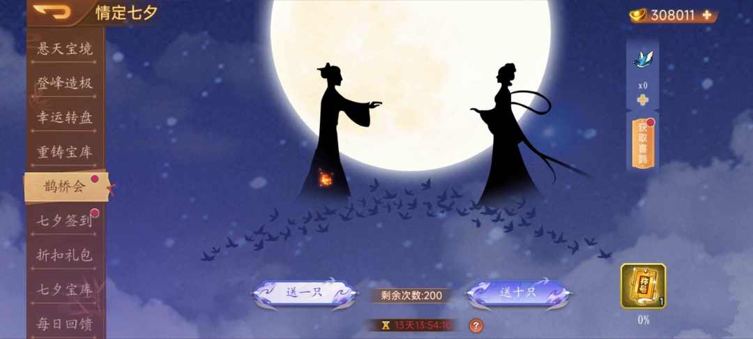 活动内容:活动期间,完成任务或者元宝购买可以获得【喜鹊】,在活动界面,通过送【喜鹊】帮助牛郎织女搭建鹊桥,每次送【喜鹊】都可以获得喜鹊的奖励,完成鹊桥搭建,还可以获得牛郎织女的奖励。