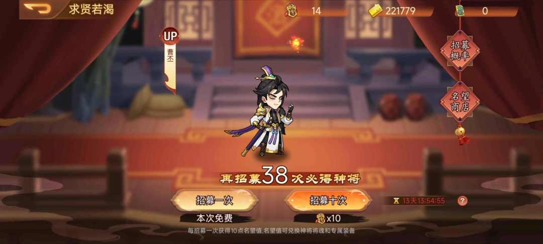 活动内容:活动期间,可通过消耗招募令进行招募武将,up武将的概率会高于其他同档位武将(每期活动会更换up武将),每次招募可获得10名望,名望可在名望商店兑换道具。
