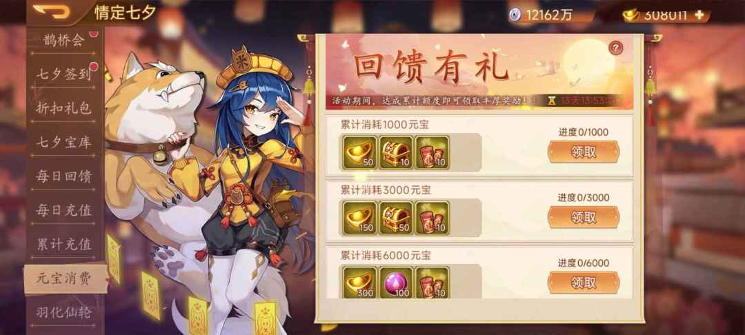 活动内容:活动期间,累计消费元宝达到目标值即可领取奖励!