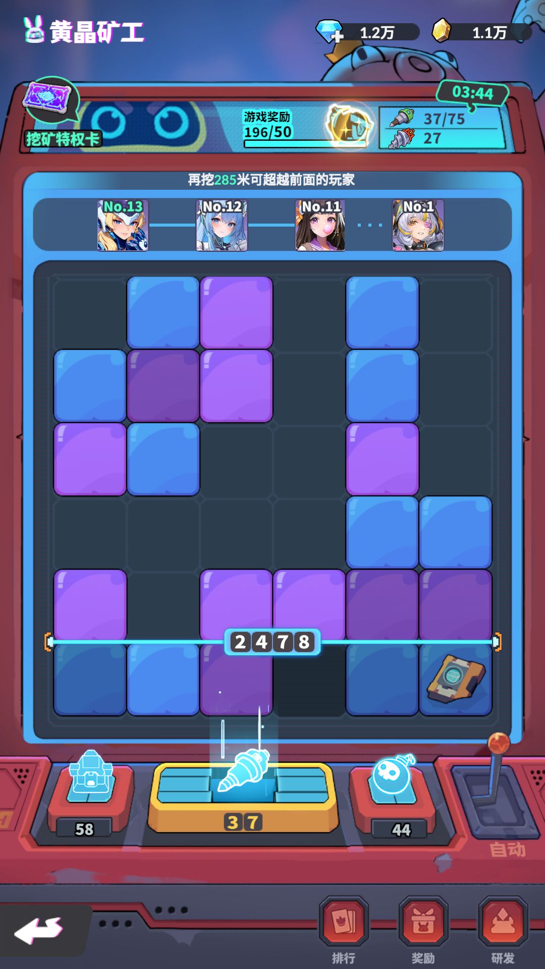 首先就是挖矿功能界面的介绍,右上角的绿色钻头和红色钻头,其实功能是一样的,都是能对砖块格子造成1点伤害。唯一区分就是,绿色的钻头会随着时间回复次数,而红色的钻头不会。
