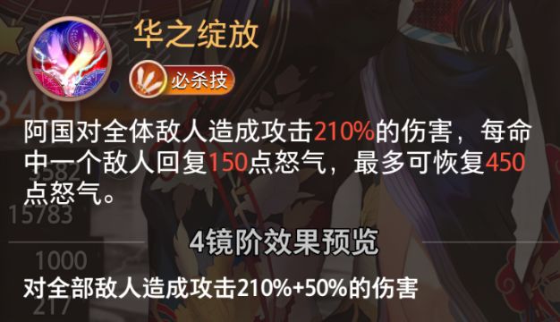 阿国对全体敌人造成攻击210%的伤害,每命中一个敌人回复150点怒气,最多可恢复450