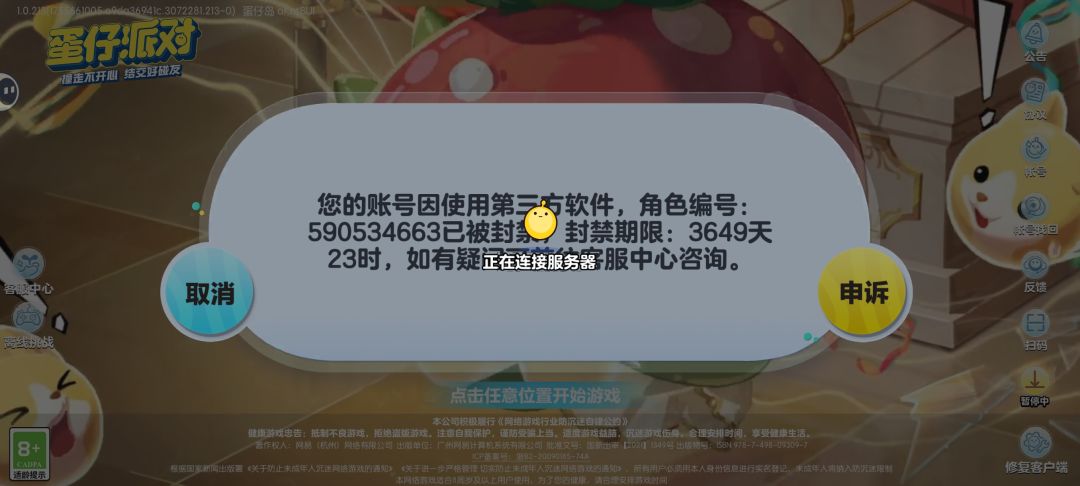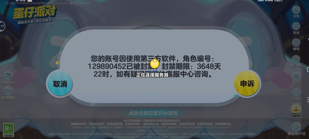 前些日子,我把游戏下回来。然后和妹妹玩儿两局,今天就说封号了。说什么我用第三方软件还是什么东西的?