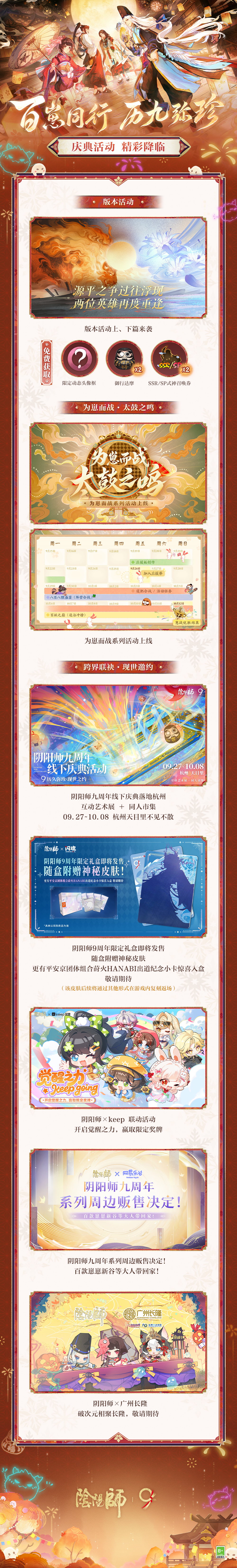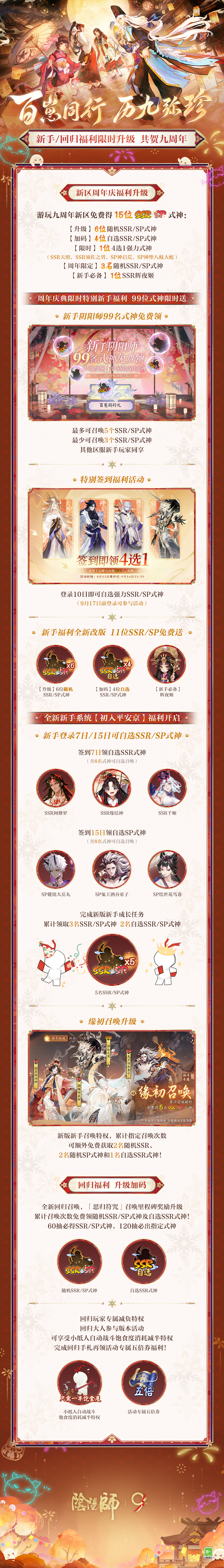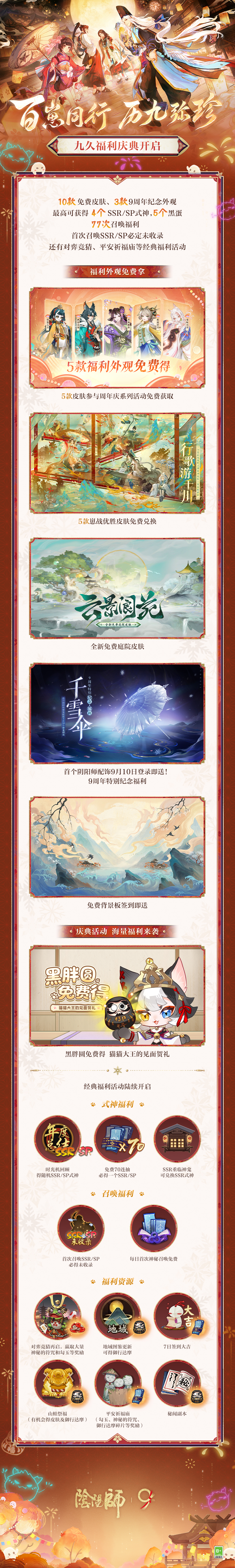 ※九久福利庆典将启,10款免费皮肤、3款九周年纪念外观、最高可获得4个SSR/SP式神、5个御行达摩等海量活动福利!