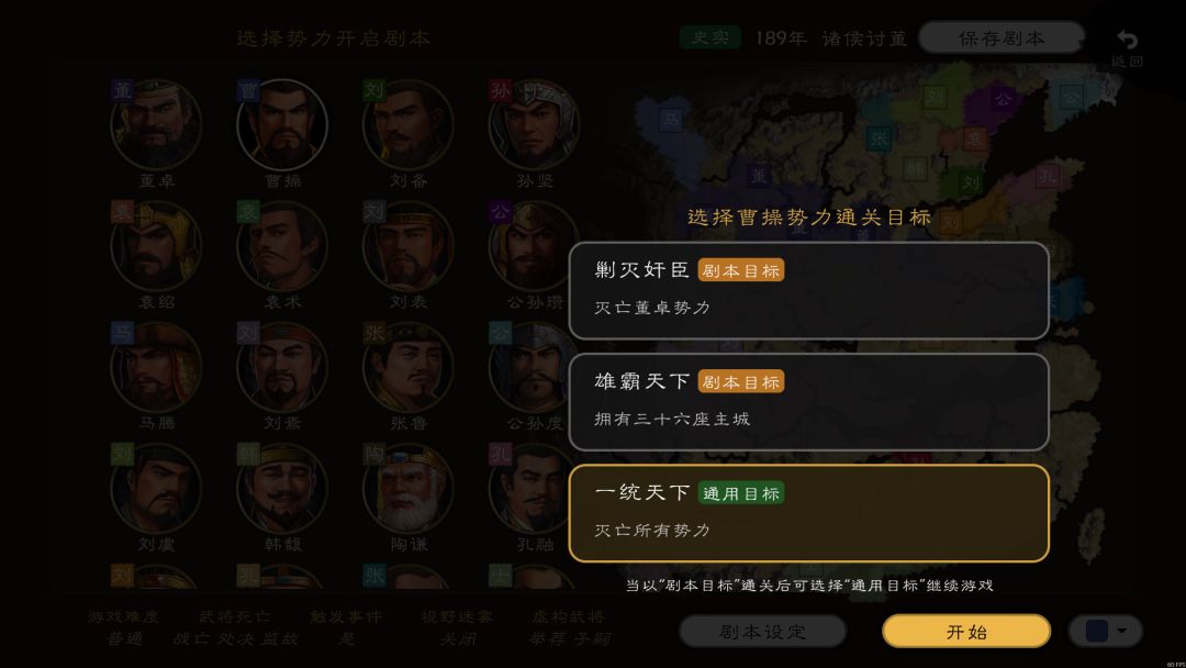 在不同的历史阶段,一些特定的人物会有其历史宿命。游戏中新增【剧本目标】玩法,新建剧本时,指定势力后可以选择该人物的剧本目标(非所有势力均有目标),完成既定目标后可选择提前结束游戏或选择以“大一统”为目标继续游戏;