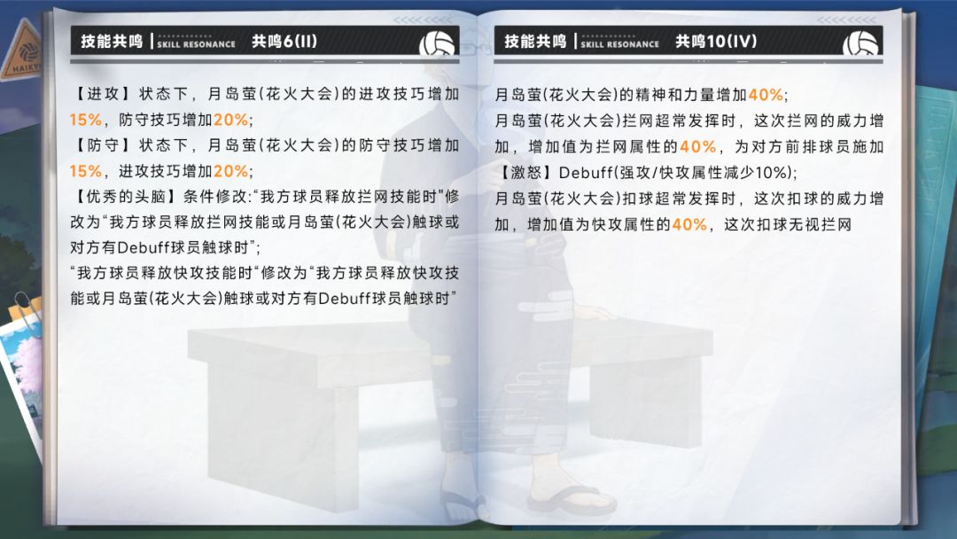 【进攻】状态下,月岛萤(花火大会)的进攻技巧增加15%,防守技巧增加20%;