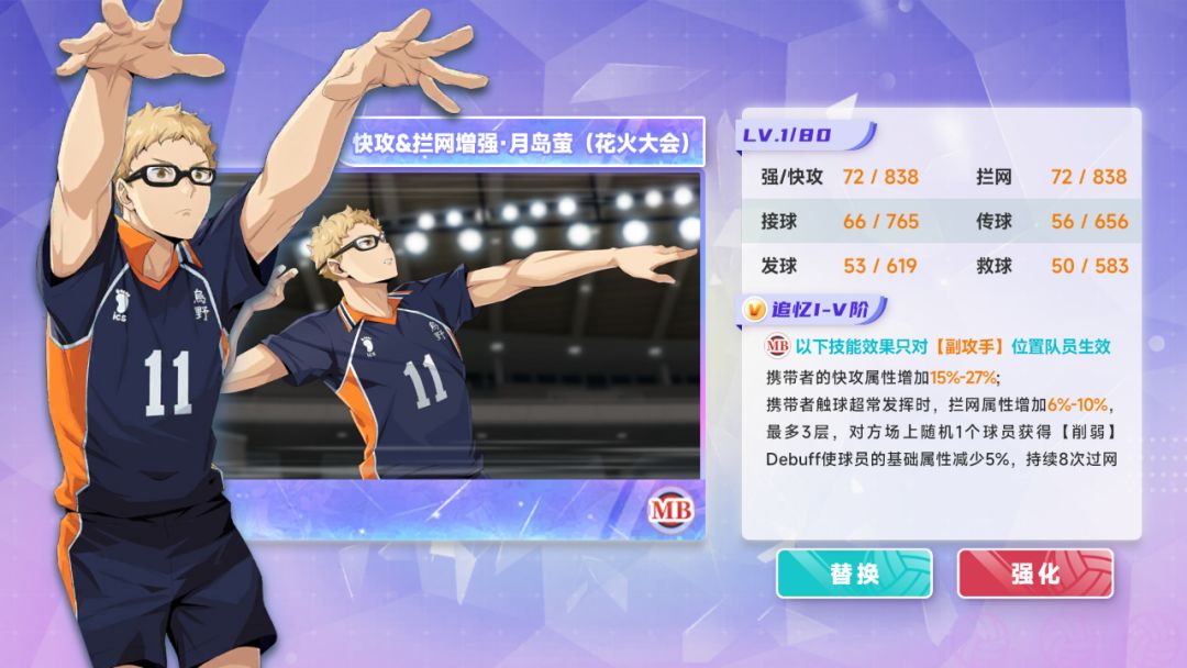 【解析】增加双端属性,以及非常重要的挂Debuff的能力,对于月岛来说没有什么好用的下位替代了。如果在队伍里是纯快攻或者纯拦网的定位的话,可以选择用SP翔阳的/SP黑尾的追忆。