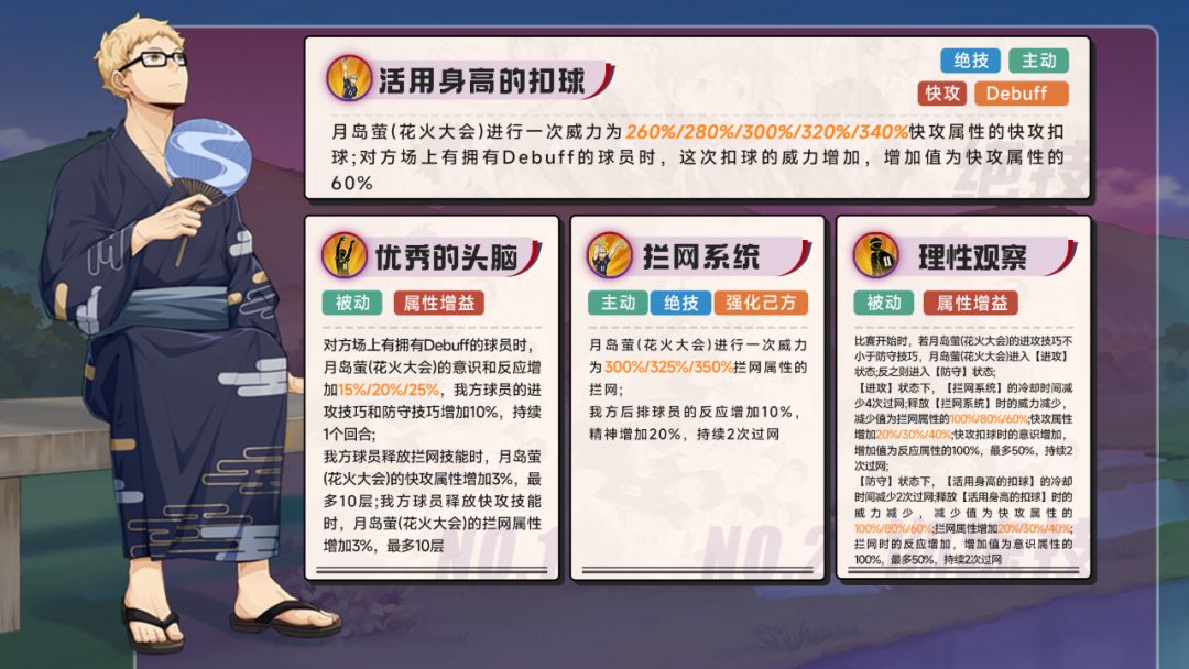 月岛萤(花火大会)进行一次威力为260%/280%/300%/320%/340%快攻属性的快攻扣球;对方场上有拥有Debuff的球员时,这次扣球的威力增加,增加值为快攻属性的60%【解析】光看一级260%不算高,不过只要对方有DEBUFF就有一级320%的恐怖倍率,而且这也不算是个苛刻的条件,几乎是常驻。