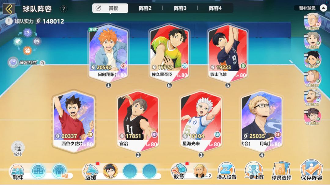 阵容的核心还是影山、SP月岛、SP翔阳,SP西谷纯是为了和影山的上阵羁绊,换成古森也是可以的。自由人大概率还是替换WS和OP位,所以这两个位置的球员可以替换成其他角色,比如OP位带大地。星海推荐保留,无论什么状态下的SP月岛,都需要星海作为第二栏网手去应对对方的扣球。教练带乌养教练,能增加快攻威力,还能随机减少场上一个球员的绝技CD。