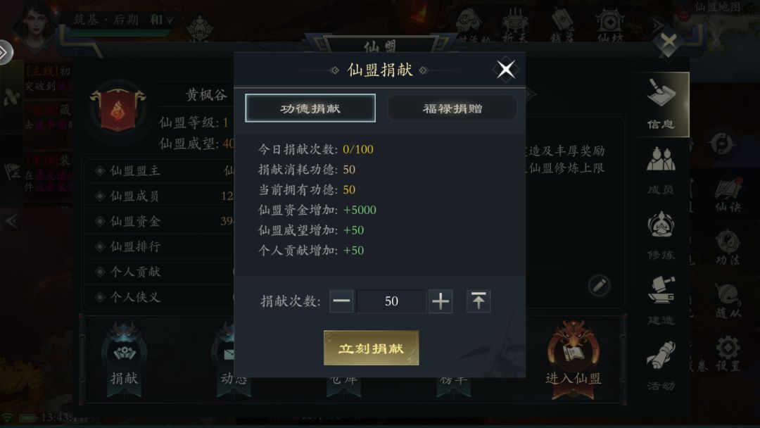 仙盟每日可捐献功德*100,用于建设仙盟和强化自身属性使用