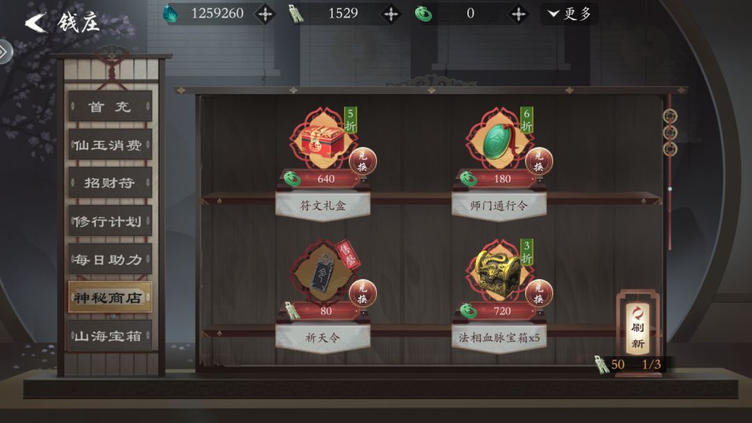 神秘商店每天可以灵玉刷新三次,首次20玉,第二次50玉,最后一次100玉。前期建议最多刷新1次,后期灵玉不缺的情况下可以刷2-3次。