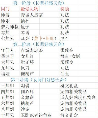 现在优先送对应喜好礼物给:七师兄,守门人,大师兄,福娃和菜园子,可以在最缺祈天令、灵石、灵玉和盘古女娲的前期获取。
