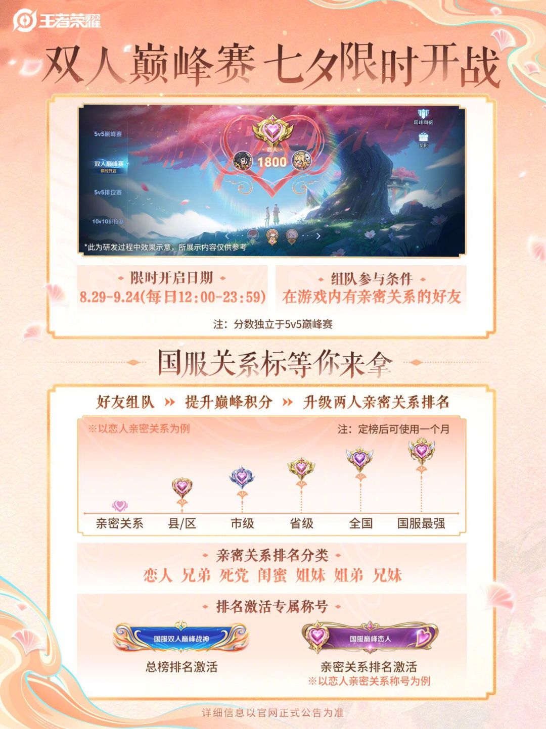 8月29日~9月24日双人巅峰赛限时开战,和亲密关系好友组队,共同角逐国服亲密关系排名!