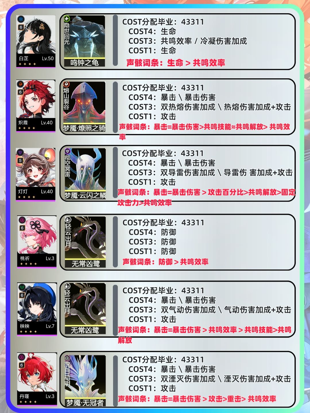 冉芝又来了!2.6版本已经更新了,为了大家能在2.6版本顺利游玩,我为大家带来了鸣潮v2.6版本的全角色声骸推荐,这次包含了所有的四星和五星,新手也能用四星过渡。注意:已更新奥古斯塔的声骸推荐。