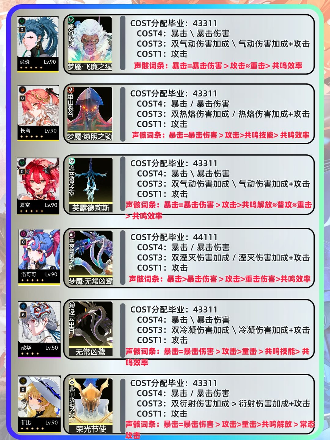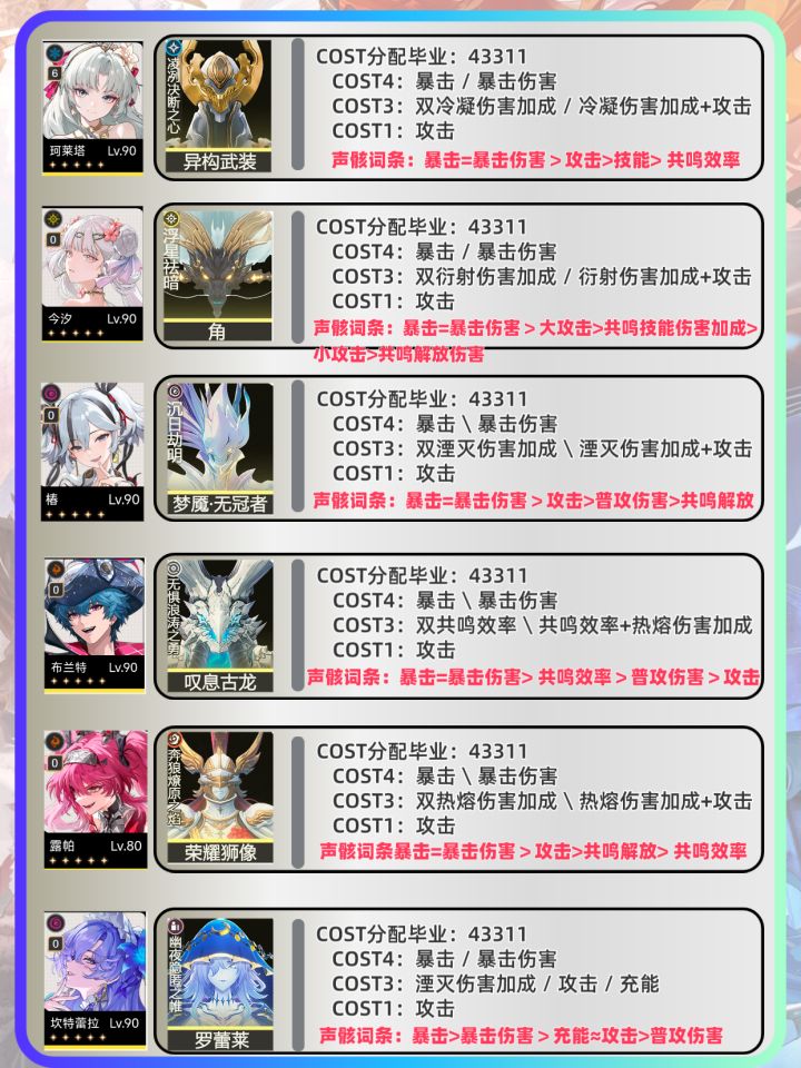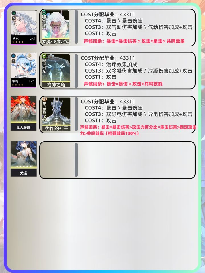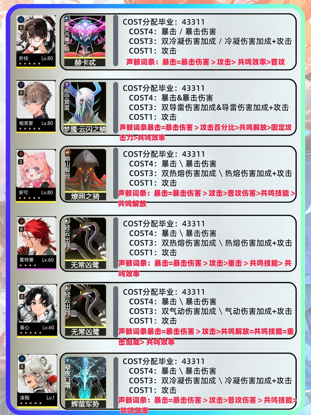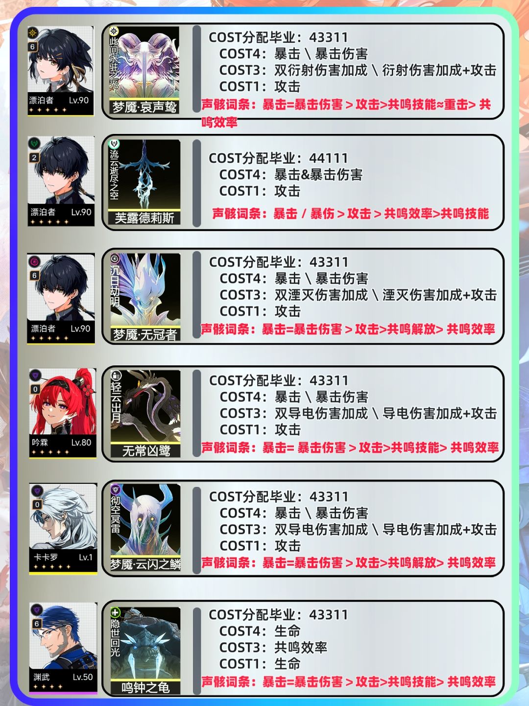 🔔以下是全角色声骸搭配的推荐方案,结合角色定位、主流配队需求及版本环境(截至新版本更新)整理,涵盖五星与四星角色。