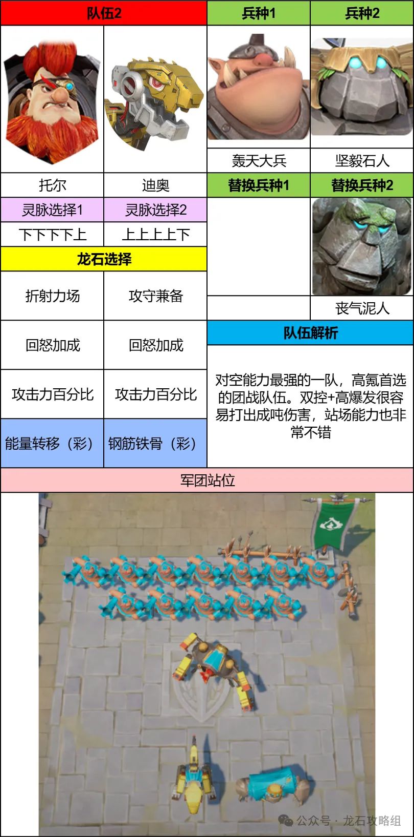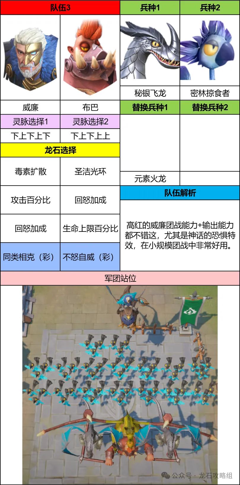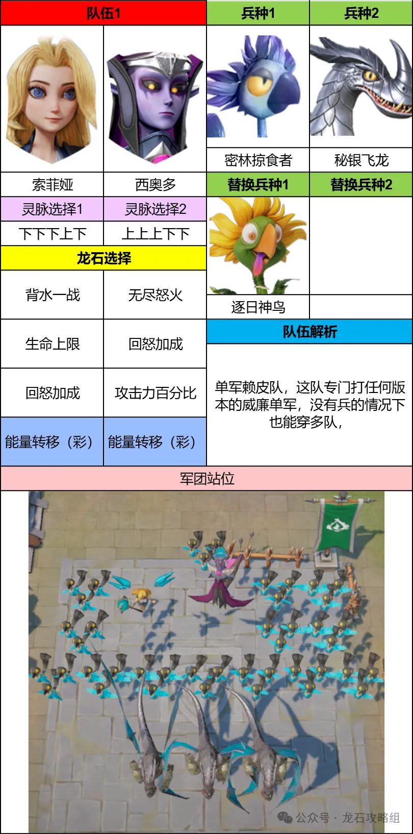 高氪组队伍要考虑3个点:1.由于现在空军被削弱,单军后期只能出一队,多了军饷也不够,更多时候要考虑团战2.本套推荐传说以上+以上且有一定养成度的玩家使用3.为了追求兵种培养最大化收益这里只推荐,配将只考虑最多五个兵种(多了点不满强度不够),魔龙在团战中收益很小,所以这里基本推荐用秘银飞龙