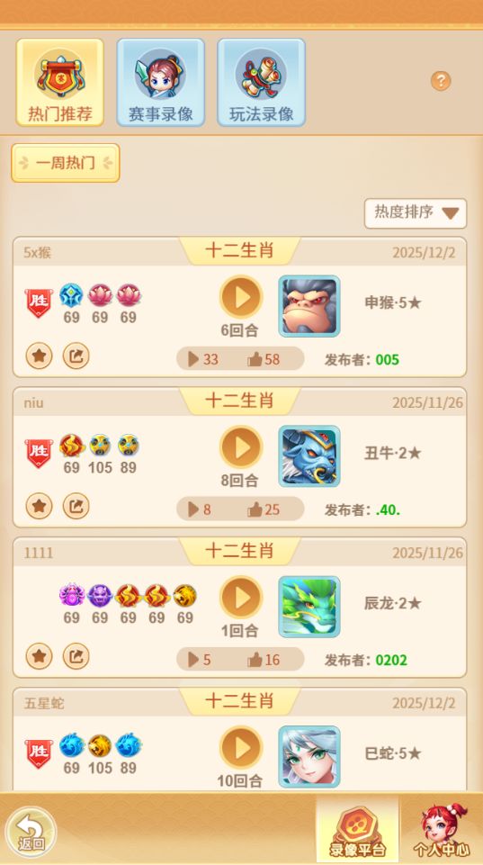 录像站汇集了全服务器玩家上传的战斗录像。各位少主可在录像平台热门推荐、玩法录像等分页中进行查看