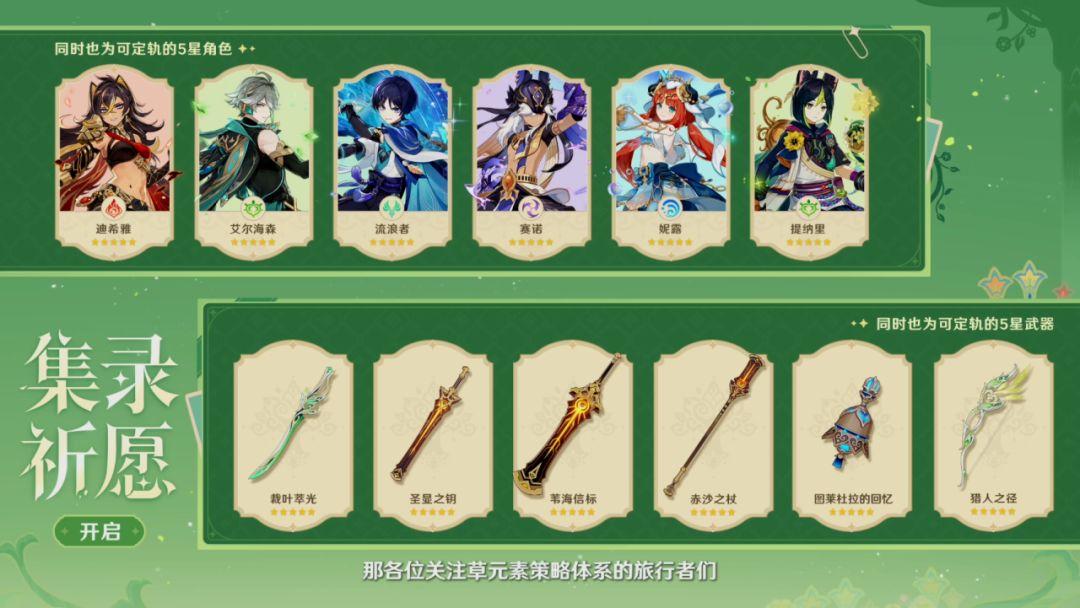 本次集录祈愿卡池均为须弥角色,建议大家结合上半池一起考虑,构建自己的草体系。