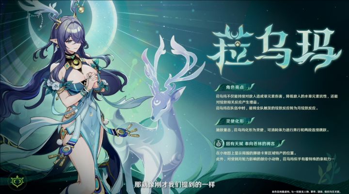 菈乌玛5星草元素法器角色,她为我们带来了全新的月绽放反应。她的技能可以降低敌人水草抗性,对绽放相关反应提供增益,属于草元素相关体系的补强。