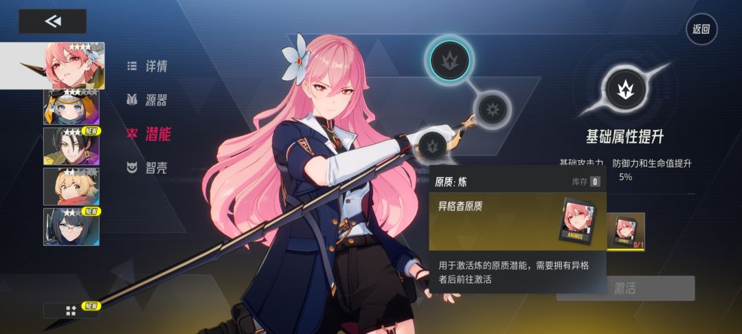 Ø 潜能:包含技能系统和命座系统,其中命座吃本体升级,增益有限,没有技能机制转变,只有属性加成,而且加成幅度不高,平民可以不用理会;而技能系统在特定等级需要消耗进化晶格晋升,日常无法获得,产出于特定活动、任务奖励、首通,谨慎使用。
