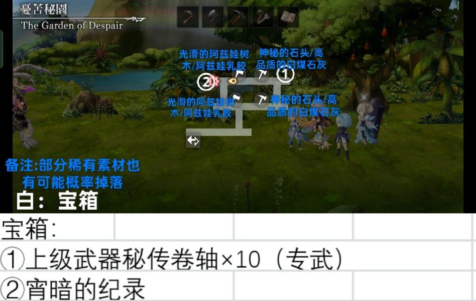 *采集和挖矿材料地图标记点请参考 1到3话流程的地图和 攻略第2部分的忧苦秘园
