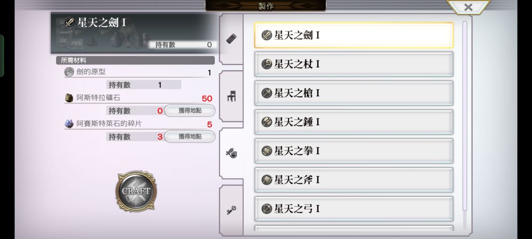 *星天武大部分制作素材均为小怪掉落和部分挖矿
