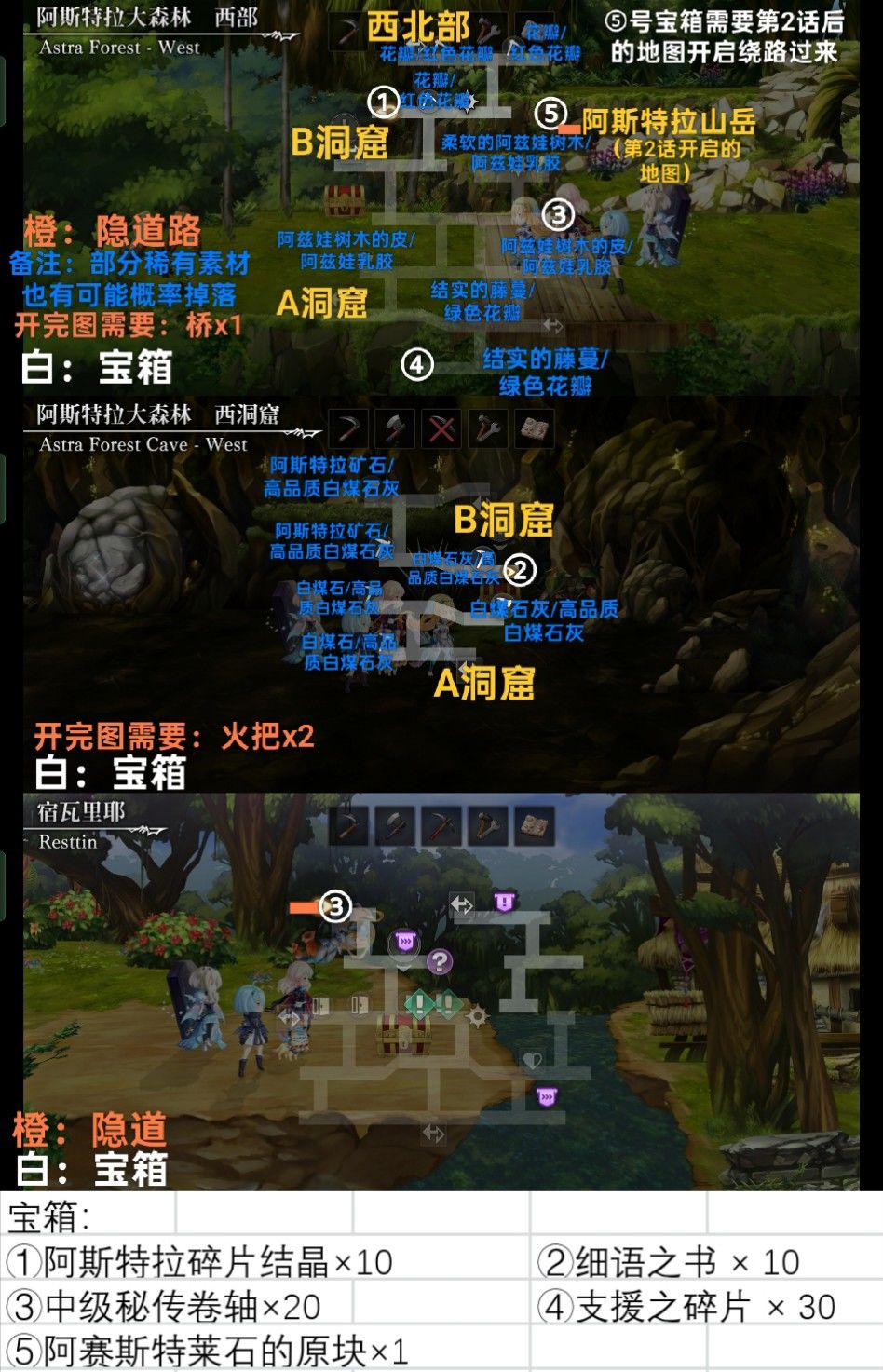 4)阿斯特拉大森林 西北部→阿斯特拉大森林 悬崖上 剧情打小怪→绕路到西北部上半地图触发剧情开快捷点回到宿瓦里耶做桥(卡外传开始挖矿采集)→做完桥后触发完剧情→第1话结束